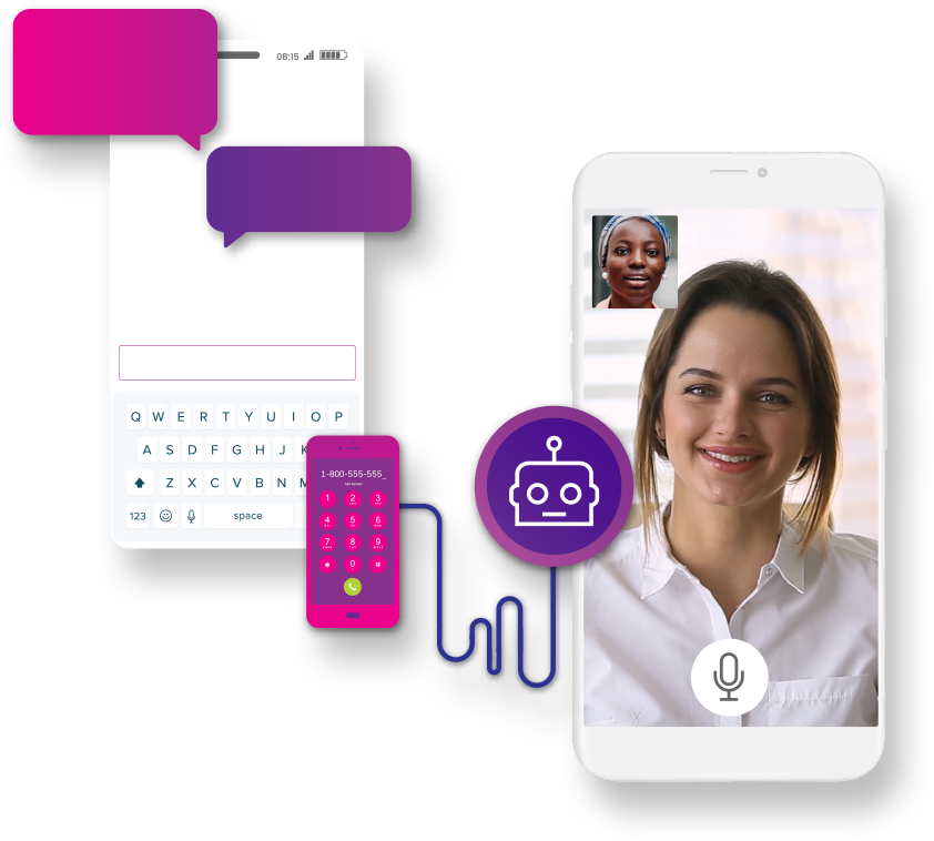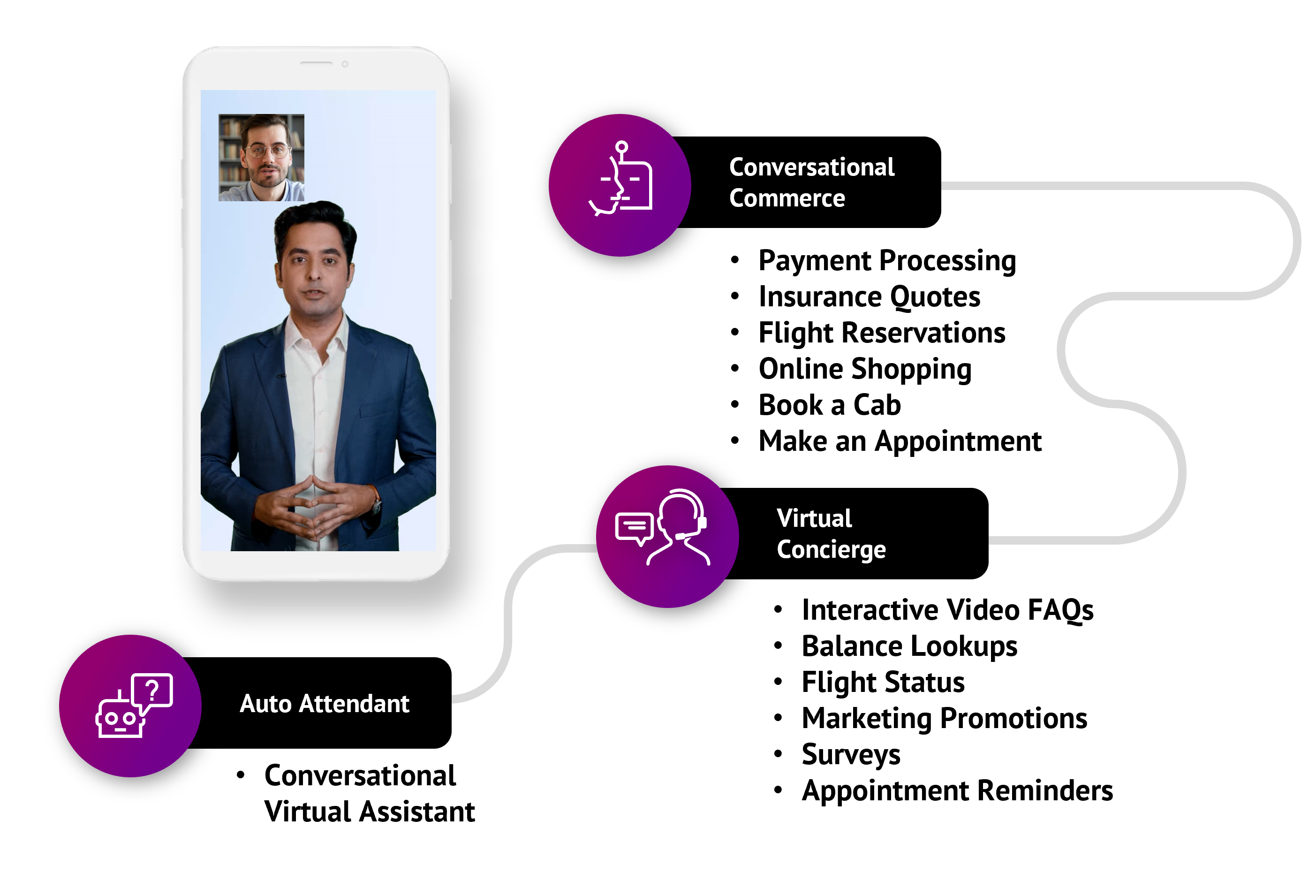 Add automated video-voice-text bot engagement to existing customer support phone numbers or embed the application on website and loyalty apps. Users can switch to video, voice, or text mode anytime, or the application can detect a suitable mode based on device capability.